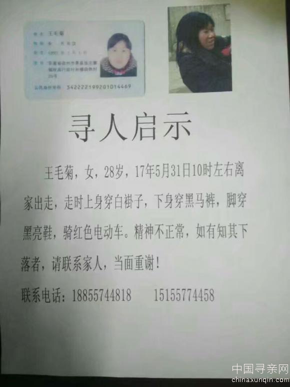 正文 失踪人员:姓名王毛菊,年龄28岁 访客 V游客 /1970-01-01/9.83 K阅读/0评论 0101 姓名: 姓名王毛菊,年龄28岁 性别: 生日: 籍贯: 失踪时间: 失踪地点: 失踪时身高: 在线联系: 微信号:shandong-1218 详情 姓名王毛菊,性别女,年龄28岁,在2017年5月31号上午10点出走,在安徽省宿州市萧县张庄寨苏果超市附近丢失,精神有点失常。身高1米5左右,穿白色上衣,黑色马裤,黑亮色凉鞋,骑红色电动车,如有看到请拨打13236091452日后必有重谢 寻人启事资料、照片等均由用户提供,如侵犯任何第三人肖像权、隐私权或其他合法权益,请联系本站删除!