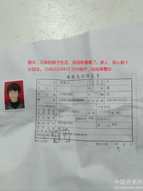 正文 失踪人员:张敬文该回家了 访客 V游客 /1970-01-01/7.26 K阅读/0评论 0101 姓名: 张敬文该回家了 性别: 生日: 籍贯: 失踪时间: 失踪地点: 失踪时身高: 在线联系: 微信号:shandong-1218 详情 山东省乐陵市黄夹镇张牌村的张敬文,几年的游子生活,该回家看看了。家人和亲戚都想你你。 寻人启事资料、照片等均由用户提供,如侵犯任何第三人肖像权、隐私权或其他合法权益,请联系本站删除!