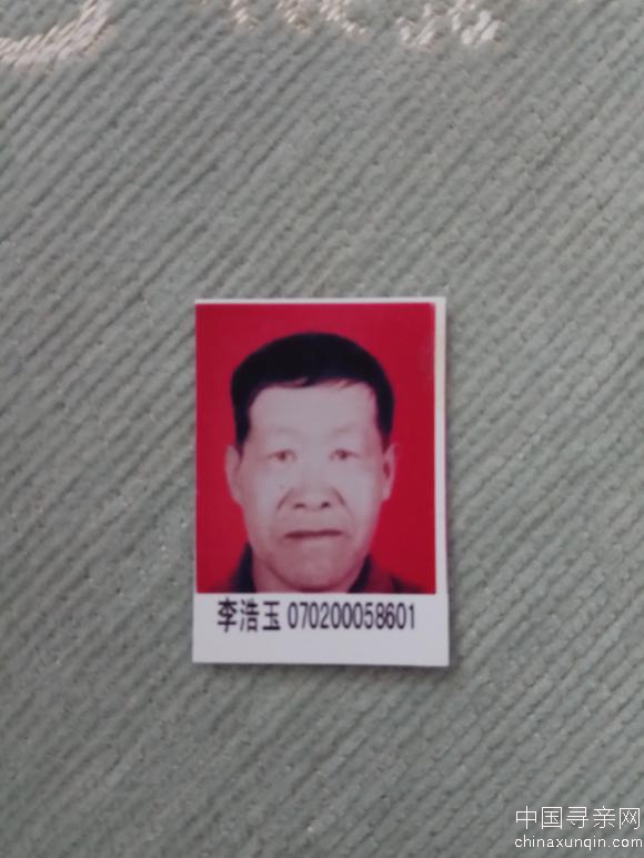 详情 李浩玉,男,年龄72岁,出生1946年3月11日。家庭住址,新疆和硕县包尔图牧场三分厂119号。相貌如图,身高1.67左右。因于家人闹矛盾于2007年在兰州出走,走时所用一代身份证,兰州榆中口音,离走时上门牙缺失一颗,现多年寻亲无果,请求各位帮助,联系电话18149968720